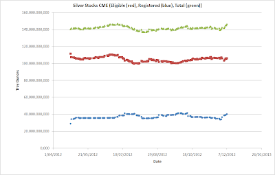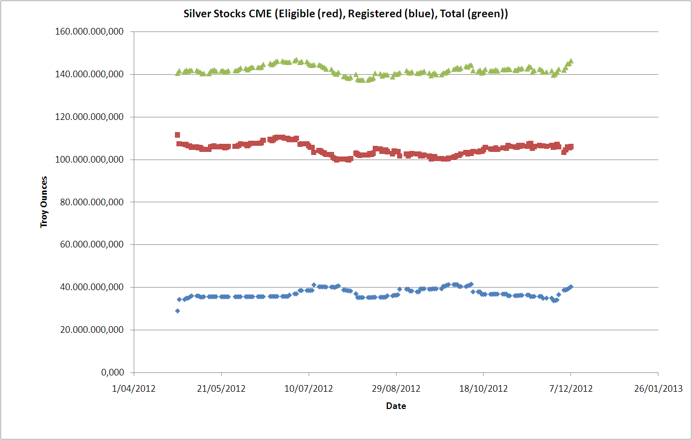5. The silver stock at the COMEX has been rising, which indicates to me a further decline in prices is probable.