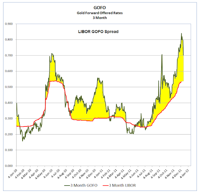 As can be seen from the first two charts [below] showing the LIBOR GOFO spread, the lease rates reported in the press are a derived rate and actually represent the amount that can be earned from the gold carry trade. I do not like to look at just the Lease Rate which is really just a calculated derivative like the ‘spot price’ based on the present value of the futures front month, but at the two major components that constitute it. Which one is driving the change in the spread, and why?