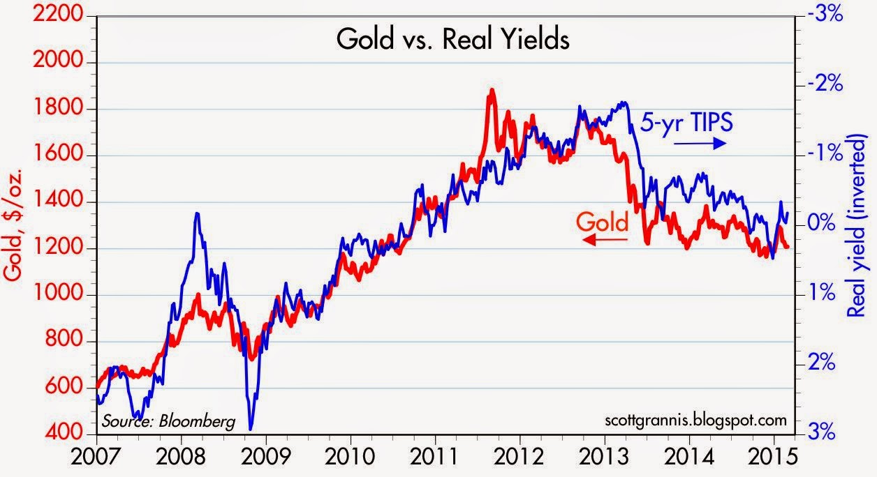 This same preference for safety is seen in the chart below which compares the price of gold with the price of 5-yr TIPS (using the inverse of their real yield as a proxy for their price). Both assets are still trading at fairly high levels from an historical perspective. This suggests that the market is still dominated by pessimism, not optimism. In a very optimistic market environment, the price of gold would be an order of magnitude lower, and the real yield on TIPS would be north of 3%. We are many years away from either.