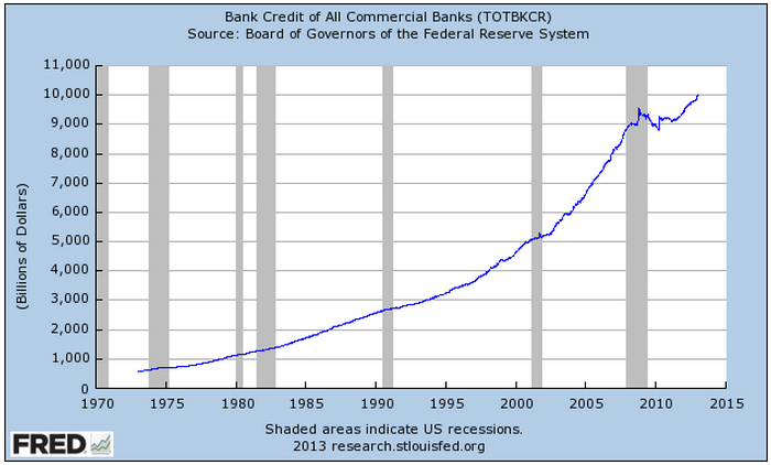 In today’s world we have 2 opposing forces, one is Ben Bernanke’s public sector credit expansion (Chart 1) and the other is private sector credit contraction (Chart 2). If credit grows, all is well, but when they cancel each other out and credit contracts, a recession will start. To make it easy I took the credit growth chart for the money creation of banks (Chart 1). For the private sector I took the household debt chart (Chart 2).