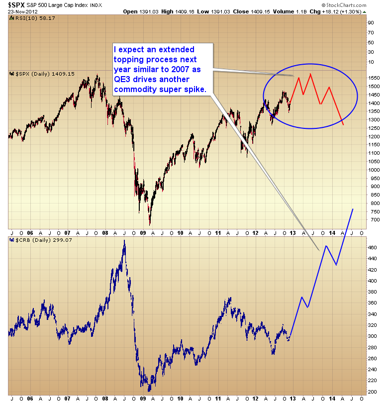 Coincidentally, that is when the dollar is due to form its yearly cycle low. A yearly cycle bottom is the most severe cyclical decline other than a three year cycle low (the next one of those isn’t due until mid-2014). I think we can safely assume that QE3 is going to complete the head and shoulders topping pattern for this particular three year cycle.