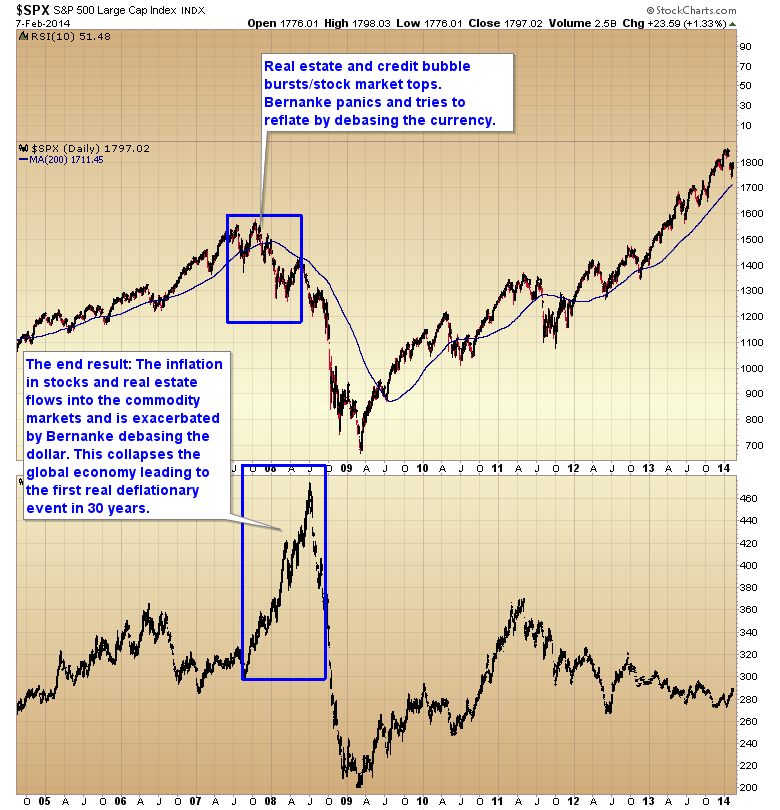The Fed is going to make the exact same mistake they did during the last decade. Their easy monetary policy has produced a bubble in stocks just like it produced a bubble in real estate in 2005. When the bubble implodes the Fed will try to reflate. They won’t succeed in reflating the broken stock market parabola, but it will trigger an explosion in commodity prices. The rapid spike in commodity prices will collapse the global economy just like it did in 2008.