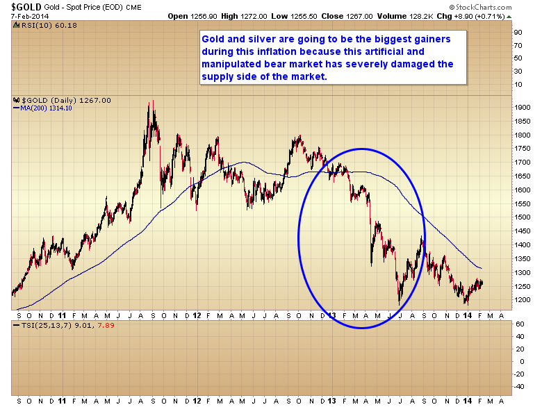 Because the artificial and manipulated bear market of the last year has severely damaged the supply side of the market, I expect the gold and silver will be the largest beneficiaries during the Great Inflation of 2014.