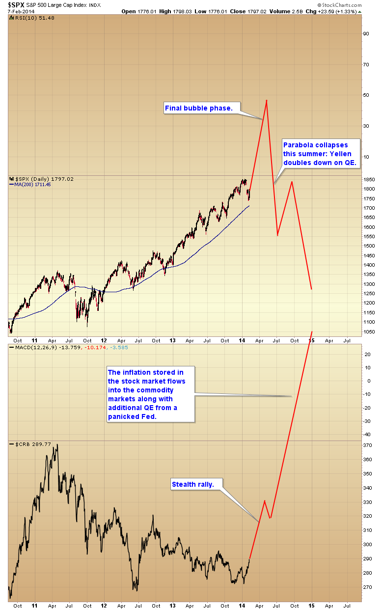 When the crash begins the inflation stored in stocks will flow into the commodity markets. This process will be exacerbated as Yellen reverses the taper and doubles down on QE to try and reflate the stock market bubble. This will be like throwing gasoline on a fire, and will drive commodity prices through the roof into the end of the year and probably the spring of 2015.