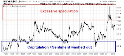 What about the ratio of gold stocks to gold? The chart below shows the HUI to gold bullion ratio. While we are nearing levels where a meaningful bottom can be established, readings are not at screaming buy levels yet.