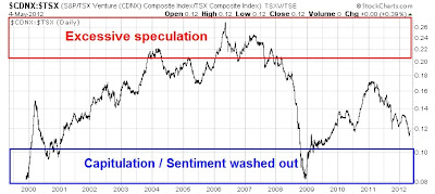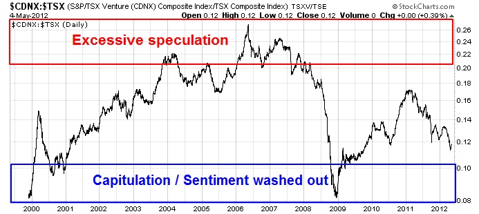 Here in Canada, we also have a good measure of speculation levels in resource and junior resource stocks. The chart below shows the ratio of the TSX Venture Index, which is comprised mainly of junior resource companies, against the more senior and established TSX Composite.