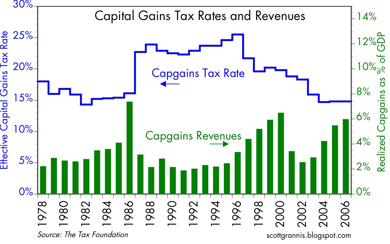 - If we reduced capital gains taxes tomorrow I would bet a lot of money that federal revenues would rise. I for one would sell a lot of things that I have avoided selling. I would also diversify my portfolio in the process, and I would be much more willing (and able) to invest in new things.